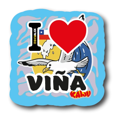 ¡Lleva la esencia de la Ciudad Jardín a todas partes! Colección 'I ♥ VIÑA' de Kaiju. Sticker premium de 6x6cm con vinilo de alta resistencia y laca sectorizada. Diseño exclusivo de @DCVALEX con la clásica gaviota de la costa de Viña. Ideal para tu notebook, auto o botella.