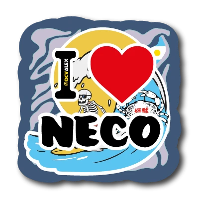 ¡Cabalga la Ola Nocturna de Necochea! Colección 'I ♥ NECO' de Kaiju. Sticker premium de 6x6cm con vinilo resistente al salitre y laca sectorizada. Diseño exclusivo de esqueleto surfeando, ideal para boards o tu ride. Garantía Shaper: Redo hasta Stoked.
